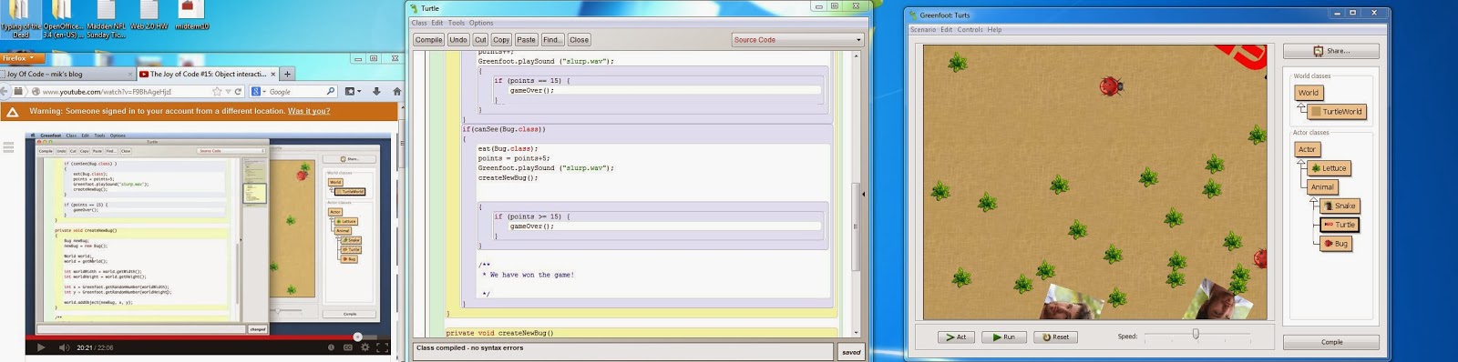 So contrary to what the professor said I actually found two bugs over my long comb to fix things. The first bug I found was that since there was no victory scenario if program in the lettuce section you couldn't win unless you ate a bug. This was annoying so I fixed it. The second took a bunch of tests before I realized what was causing the problem but because bugs give you 5 points and it was set to win at exactly 15 if you went over (e.g. 16, 17, 18, 19) you wouldn't win even though you should have. I mucked around and found changing the == to a >= fixed this problem.